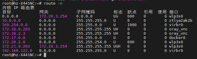 U表示该路由是可用的 (up)G表示该路由是一个默认网关 (gateway)H表示该路由是一个主机路由 (host)UG表示该路由同时具有默认网关和可用的属性UGH表示该路由同时具有默认网关、可用和主机路由属性