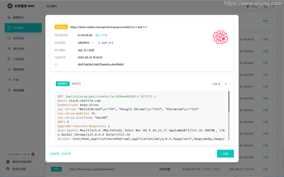 攻击检测使用了业界首创的智能语义分析算法,同时还具备威胁情报、动态限频、智能建模等多种高级防护模式。