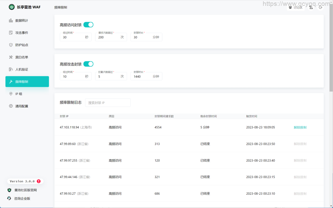 雷池通过高频访问封禁和高频攻击封禁能力,可实现访问频率控制以对抗 CC 攻击。