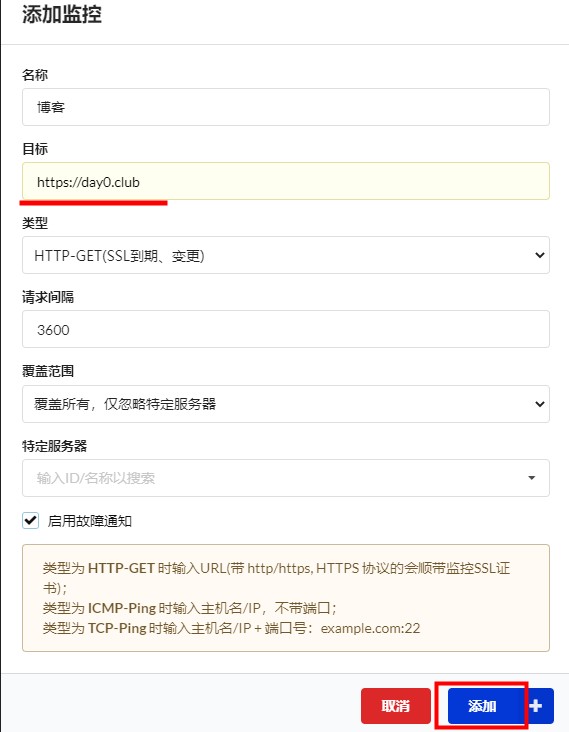 1、选择服务,添加服务,这里可以配置监控HTTP、TCP、Ping 相关服务。(这里以http监控博客web服务为例,请求周期为3600秒)