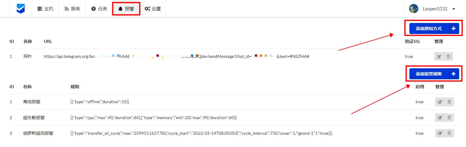 2、选择报警,添加通知方式(这里以通知到 TG 为例)。