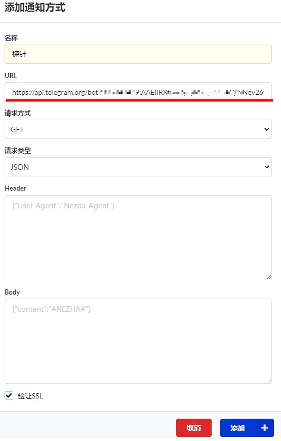 URL输入:https://api.telegram.org/botXXXXXX/sendMessage?chat_id=YYYYYY&text=#NEZHA#
