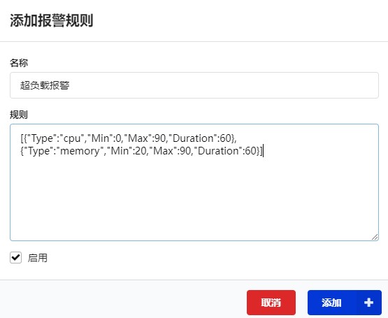 cpu、memory 内存、swap 交换内存、disk 硬盘、offline 离线监控、net_in_speed 入站网速、net_out_speed 出站网速、net_all_speed 双向网速、transfer_in 入站流量、transfer_out 出站流量、transfer_all 双向流量、offline 离线监控、transfer_in_cycle 周期内的入站流量、transfer_out_cycle 周期内的出站流量、transfer_all_cycle 周期内双向流量、cycle_start 周期开始日期(可以是你机器计费周期的开始日期)、cycle_interval 小时、duration:持续秒数,秒数内采样记录 30% 以上触发阈值才会报警(防数据插针)、min/max 最小/最大、load1/load5/load15 负载、tcp_conn_count / udp_conn_count tcp/udp连接数