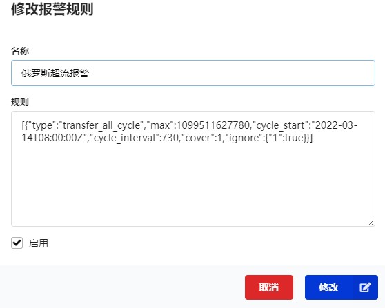 ③、流量报警,注释:指定序号为 1 的主机,从2022.3.14早8点开始,每730小时(差不多1个月)内,总流量(双向流量)超过1099511627780 B(1TB),则进行通知。