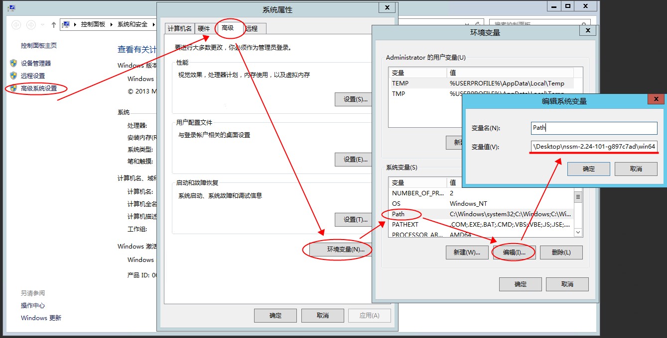 3、打开系统属性–高级–环境变量–系统变量–Path,在最后端把刚才的nssm.exe路径复制进去。注意: 和前面变量之间用英文分号 ; 隔开