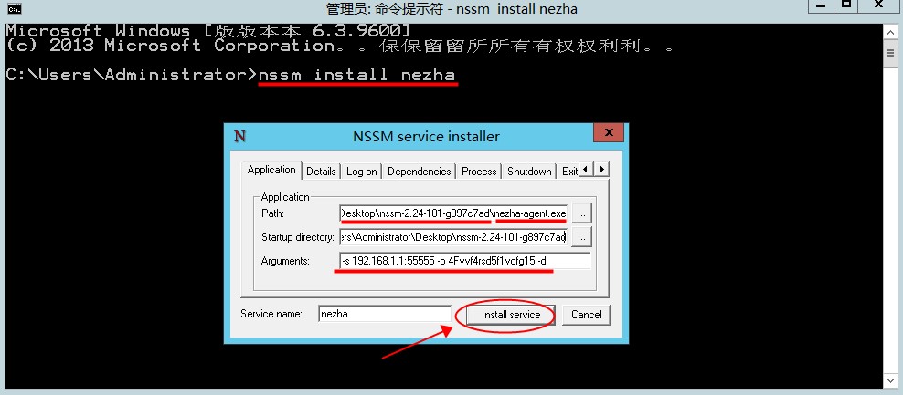 回车后,会出现配置窗口,在Path 内输入nezha-agent.exe 的完整路径,在Arguments内输入:
