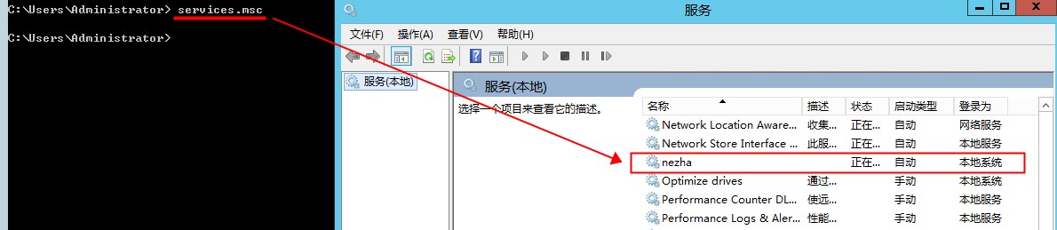 6、检查服务是否运行,输入services.msc, 在弹窗内找到 nezha 服务经常,显示正常运行即代表成功。