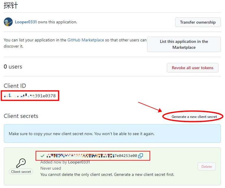 点击创建Client secrets ,然后记录下 Client ID 和 Client secrets,备用。