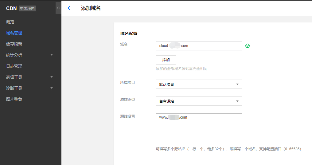 因为笔者不喜欢将CDN直接套在主域名上(因为今后可以选择在腾讯云上启用COS+CDN方案),所以我另外开了一个二级域名来作为静态文件域名,就是这里的 cloud.example.com 。