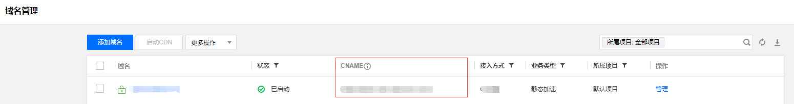 到此,腾讯云的CDN创建完毕,我们需要在域名管理列表里找到这个域名的加速域名CNMAE解析并记录下来。