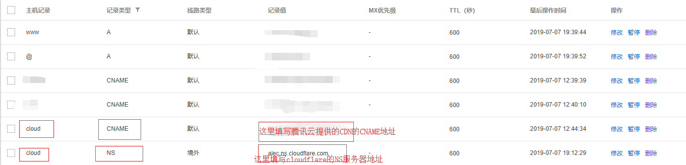 这里我们需要设置境外ns记录值为CF的服务器地址,cname设置为腾讯云cdn的cname地址,这样国内IP访问就是通过腾讯CDN,而国外ip访问就是CF的全球加速节点。