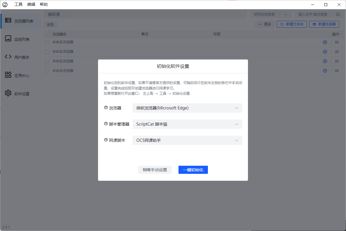 - 使用一键初始化按钮,可以直接安装脚本和脚本管理器,创建浏览器后点击运行即可一键刷课,傻瓜式操作。