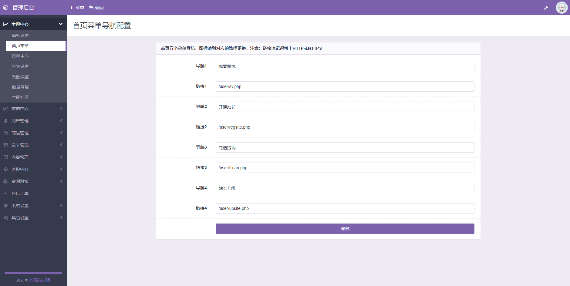 4.增加首页五个菜单配置,进入后台,点击主题设置-首页菜单;