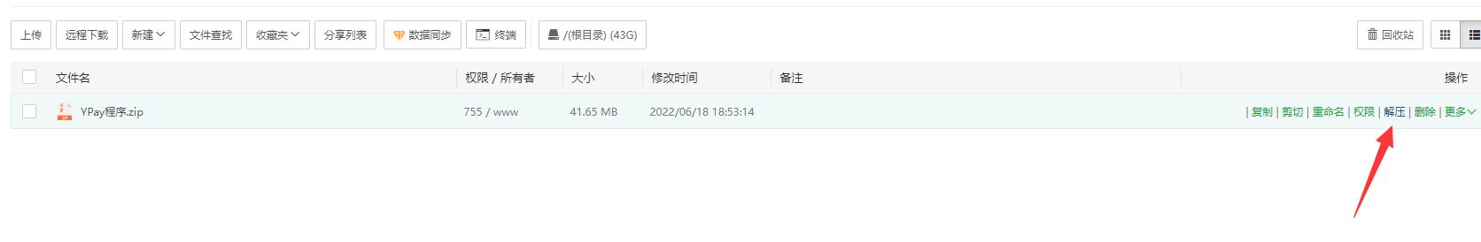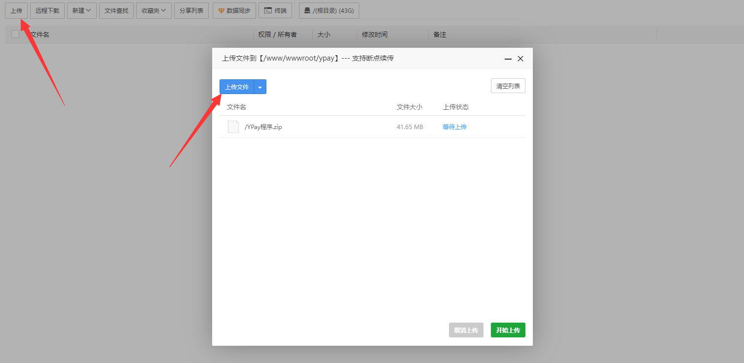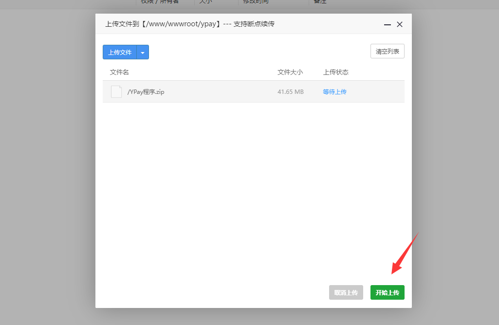 4.点击上传文件,选择本地电脑YPay前台程序.ZIP,然后点击开始上传,等待上传完成,关闭上传窗口。