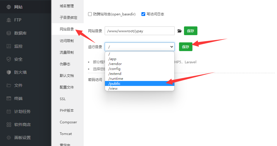 2.点击左侧网站目录,运行目录下拉选择Public,然后点击保存