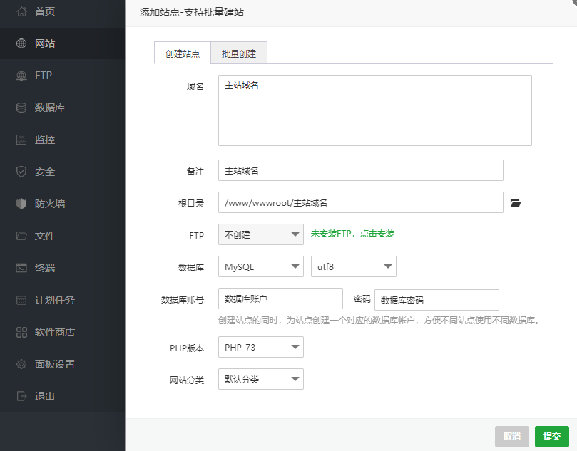 2.输入你要绑定的网站域名(上一步中域名配置所解析的域名),PHP选择7.3。都填写后,点击提交