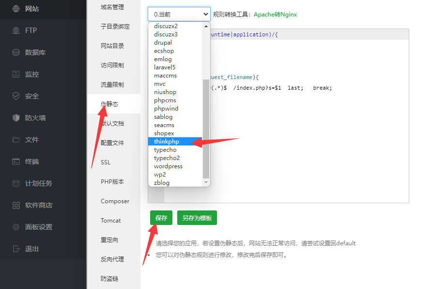3.点击左侧伪静态,下拉选择ThinkPHP,然后点击保存