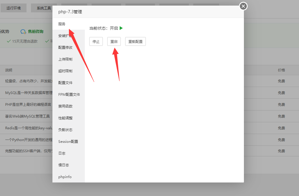 7.点击左侧菜单栏服务,重启PHP【这里以PHP7.3为例,其他PHP版本都一样得】