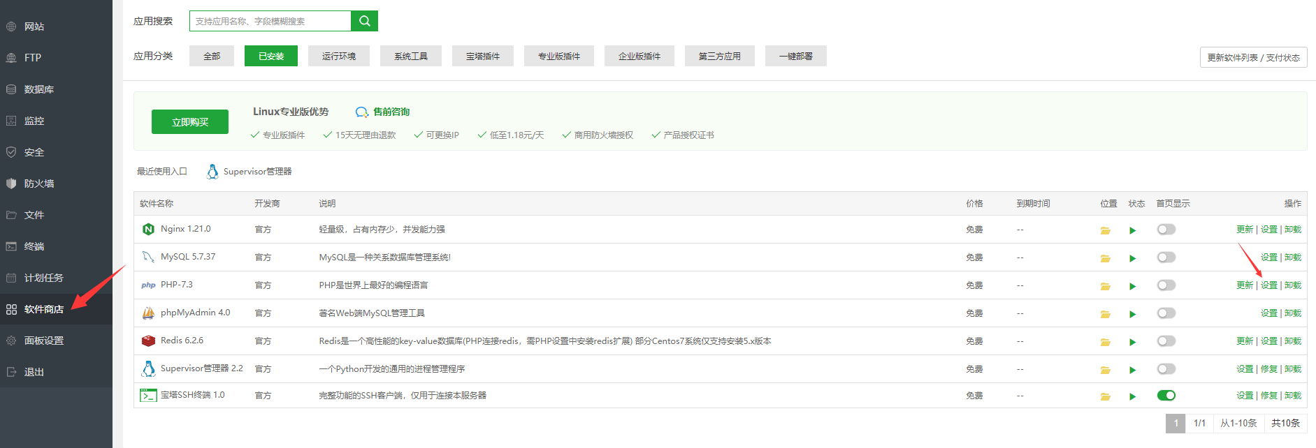 7.进入宝塔面板,选择左侧菜单软件商店,找到PHP7.3,点击设置【这里以PHP7.3为例,其他PHP版本都一样得】